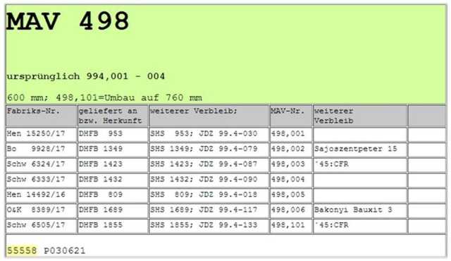Ezek mozdonyok a 498.002. (15. pályaszám), gyártotta a Borsig 9928/17. számon, és a 498.004. (14. pályaszám), gyártotta az Schk 6333/17. számon (a rövidítés feloldása valószínűleg a Siemens – Schuckertwerke gyár).