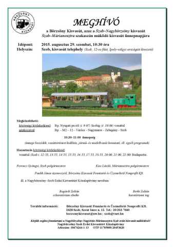 - 10:3011:00 ünnepség - vasúttörténeti kiállítás, - jármű- és modellvasút bemutató További információ: Börzsöny Kisvasút Fenntartó és Üzemeltető Nonprofit Kft. 2628 Szob, Szent Imre u. 12. Tel.: 20/203-7660 borzsonykisvasut@uw.hu ; szob@vnet.hu