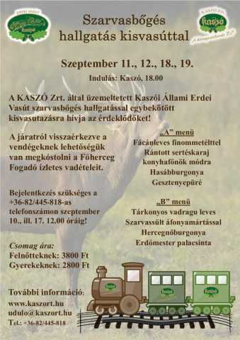 Kaszó: Szarvasbőgés hallgatás kisvasúttal 2015.08.26 (Halász Zsolt dr.) A Kaszói Állami Erdei Vasút szeptember 18-án és 19-én szarvasbőgés hallgatással egybekötött kisvasutazásra hívja az érdeklődőket! A járatról visszaérkezve a vendégeknek lehetőségük van megkóstolni a Főherceg Fogadó ízletes vadételeit. A reggeli szentai vonat ráfordul a vasútállomás előtti egyenesre. Itt még 9 kg/fm tömegű sínekből áll a felépítmény, júliusban vélhetőleg ki lesznek ezek cserélve. Indulás: Kaszó, 18.00 Menü: A menü Fácánleves finommetélttel Rántott sertéskaraj konyhafőnök módra Hasábburgonya Gesztenyepüré B menü Tárkonyos vadragu leves Szarvassült áfonyamártással Hercegnőburgonya Erdőmester palacsinta Bejelentkezés szükséges a +36-82/445-818-as telefonszámon szeptember 17-én 12.00 óráig! Csomag ára: