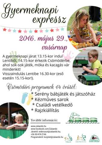 Gyermeknapi járat a Csömödéri Állami Erdei Vasúton 2016.05.18 Szeretettel vár minden kedves érdeklődőt a Zalaerdő Zrt. és a Csömödéri Állami Erdei Vasút 2016. május 29-én (vasárnap) a gyermeknapi járaton, illetve Csömödérben, ahol színes programokkal készülünk a látogatók számára. A gyermeknapi járat 13.15-kor indul Lentiből, 14.15-kor érkezik Csömödérbe. Csömödéri programok 14 órától: További információ: